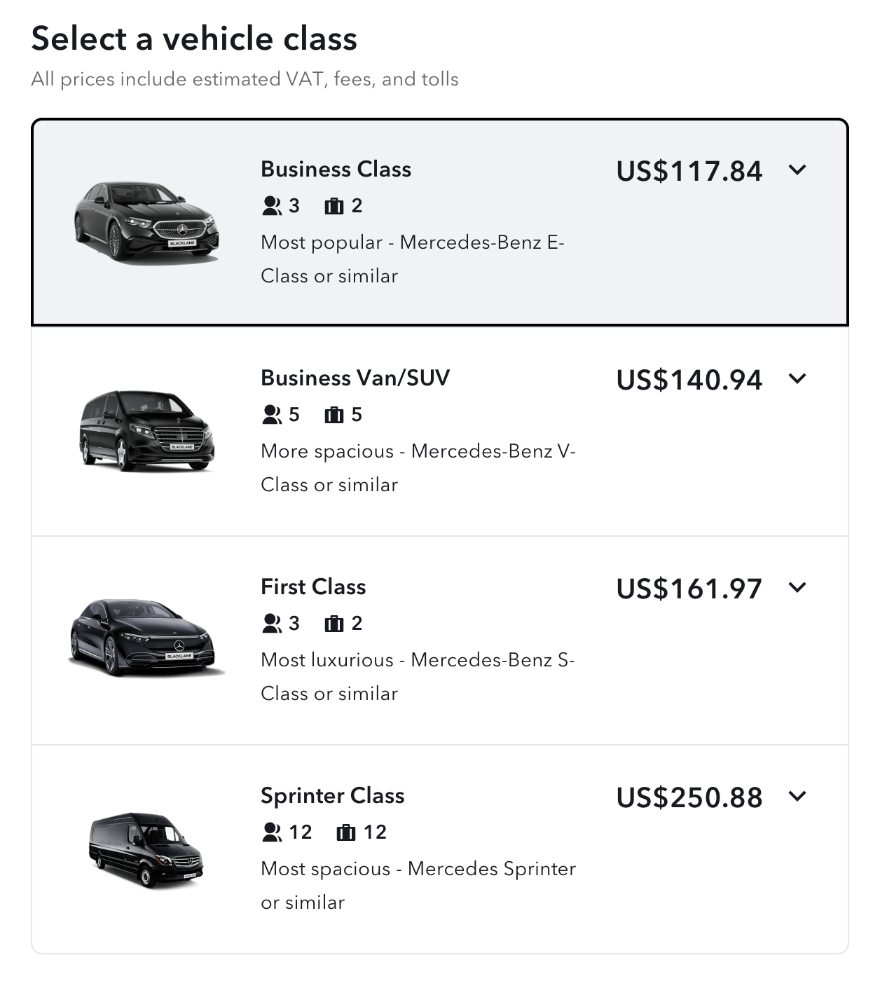 Blacklane (an on-demand car service), quoted $140 for a Mercedes Benz V Class van that seats 5